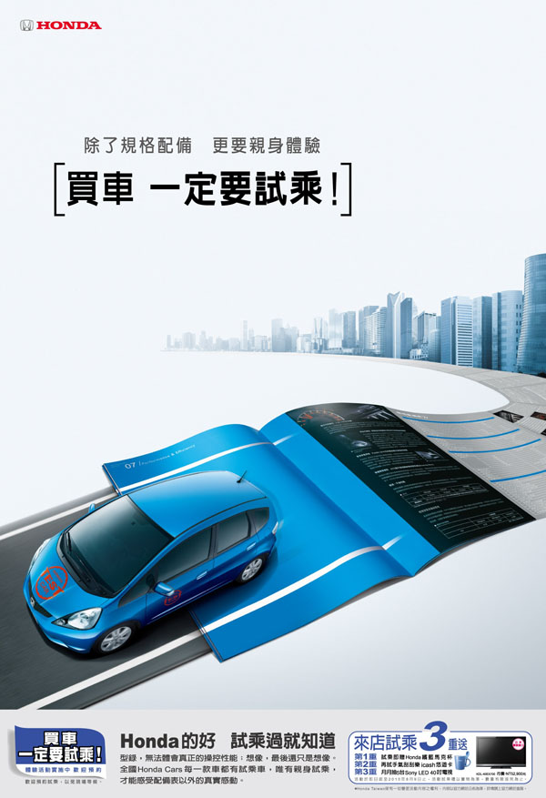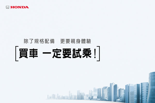 Honda堅持買車一定要先試乘,在試乘中了解車款優點及Honda傳遞給車主的駕馭樂趣,試乘後還可參加三重好禮送活動,最大驚喜帶走Sony 40吋LED電視。