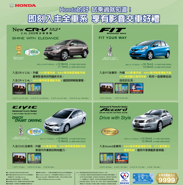 2010年7月份Honda以多項購車優惠,入主各車系可享超值影音交車好禮,月底前CR-V與CIVIC交車新車主可升級DVD影音系統、衛星導航系統,準確掌握新未來;入主都會時尚小車FIT加送DVD影音系統、衛星導航及車用數位電視,自由自在展開新生活;豪華旗艦Honda Accord加贈車用數位電視與衛星導航,讓移動生活更多樂趣。