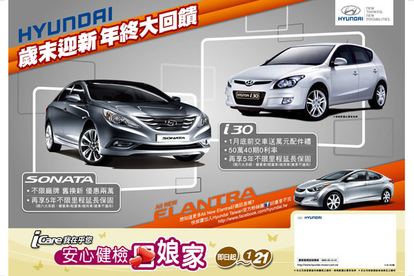 此外,Hyundai跑格旗艦Sonata推出尊榮特惠專案,不限任何廠牌,以舊車換購 Sonata,總代理南陽實業馬上贈送大紅包,現折兩萬元給換購的車主,真是買到賺到,過新年開新車領大紅包。