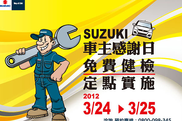 歡迎各位SUZUKI車主把握機會,讓愛車作完善的免費健康檢查,同時建議車主可先行預約回廠時間,以節省現場等候時間,詳細情形請直接撥打SUZUKI預約專線0800-098-345。
