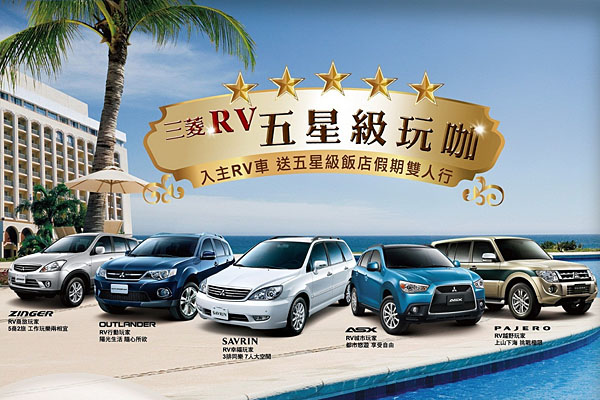 3月入主RV車,Mitsubishi招待你住五星級大飯店!「三菱RV 五星級玩咖」即日起開跑,3月底只要到全省經銷商購買Savrin、Zinger、Outlander、ASX、Pajero任一款RV車,立即送你五星級飯店雙人行住宿券,特別精選了礁溪老爺大酒店、花蓮遠雄悅來大飯店、高雄義大皇冠假日飯店、樸石麗緻溫泉會館與墾丁凱撒大飯店等10家五星級飯店,讓車主輕鬆選擇、免費入住!