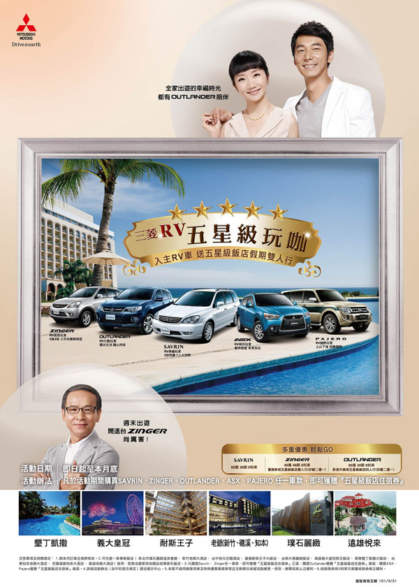 Mitsubishi特別精選了礁溪老爺大酒店、花蓮遠雄悅來大飯店、高雄義大皇冠假日飯店、璞石麗緻溫泉會館與墾丁凱撒大飯店等10家五星級飯店,凡於月底前到全省經銷商購買Savrin、Zinger、Outlander、ASX、Pajero任一款RV車,立即招待你入住五星級大飯店!而換購Zinger的車主好康多更多,買新車還可有享舊換新方案或入住五星級大飯店二擇一的超值優惠,活動詳情請洽全省Mitsubishi展示中心或5230網站(http://www.mitsubishi-motors.com.tw/)。