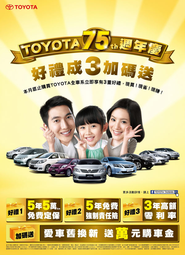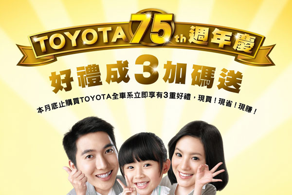「Toyota 75週年慶 好禮成3加碼送」優惠活動將自即日起展開至6月30日止,有購車需求的消費者,請儘快把握此一良機,逕洽Toyota全國經銷據點或至Toyota網站(www.Toyota.com.tw)查詢相關優惠資訊。