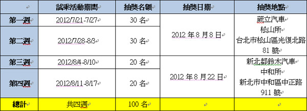 ◎抽獎日期與抽獎公佈日期:連續四週抽出共計100組,每周抽出名額如下表