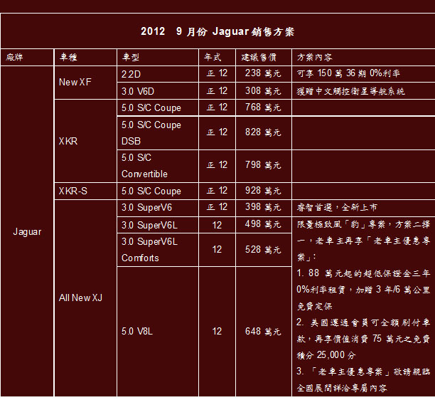 Jaguar台灣總代理九和汽車慶祝國內銷售佳績, 推出All New XJ長軸旗艦專屬優惠專案,禮遇現下已是坐擁Jaguar風雅車主們,除了與萬和租賃和美國運通卡攜手合作,針對12年式All New XJ長軸車款享有限量最後席次的「絕無僅有‧極致風豹」尊榮租賃專案,或美國運通卡會員全額刷卡尊榮入主專案,更推出專屬的「老車主優惠專案」,邀請體驗過Jaguar經典精湛美學並具有不凡鑑賞眼光的車主,再度享有與老朋友見面般的專屬禮遇,擁「豹」新世代英倫前衛風華大氣風範。