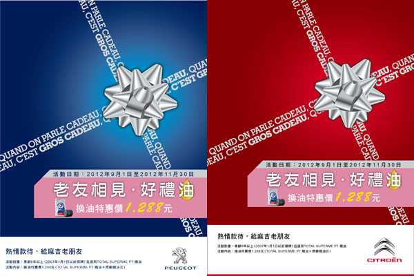 「老友相見‧好禮油」麻吉老友優惠專案,以車主愛車的角度出發,给予愛車基本呵護,為了讓車主體驗來自法國TOTAL SUPERME P7合成機油的超值特點,特地加碼贈送原廠機油芯,換油特惠組合NT$1,288元,體驗原廠售後服務水準就在此刻良機。同時,為讓車主體驗原廠換油的服務品質,本活動優惠內容,僅限於廠內更換指定機油時適用。
