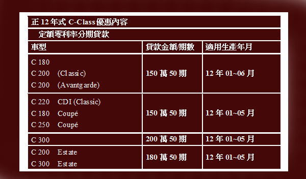 The new C-Class持續稱霸2012年台灣進口豪華車市銷售排行榜,為回饋消費者對Mercedes-Benz 旗下明星級中型房車C-Class的熱烈支持,台灣賓士特別推出C-Class全系列車款現金購車優惠專案。自10月1日至10月31日(含)止,凡購買正12年式C-Class全系列(不含AMG系列 )車款,並完成交車、掛牌之車主,可立即享有150至200萬不等的50期零利率優惠! 凡現金購車,車主還另享有超值優惠,讓您輕鬆摘星,一圓美夢。