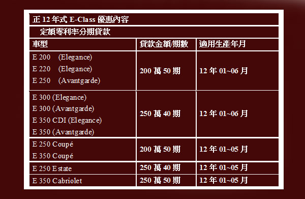 Mercedes-Benz旗下象徵優雅氣度、菁英氣質的E-Class,自推出以來便成為成功商務人士的最佳選擇。台灣賓士為E-Class全系列精心規劃超值優惠;自10月1日起至10月31日(含)止,凡購買正12年式E-Class全系列(不含AMG系列 ),並完成交車、掛牌者,即享有零/低利率貸款,低頭款,低月付輕鬆購車方案。