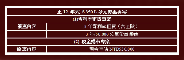 坐擁頂級豪華房車,非夢事!台灣賓士針對大型豪華旗艦房車霸主Mercedes-Benz S-Class 推出專屬正S 350 L尊榮專案,凡於2012年10月1日至10月31日(含)購買正12年式S 350 L,並完成交車及掛牌之車主,即可選擇最適合自己的「優惠租賃方案」或「現金購車方案」,現在就入主豪華旗艦車款 S-Class,尊榮一世,摘星圓夢!