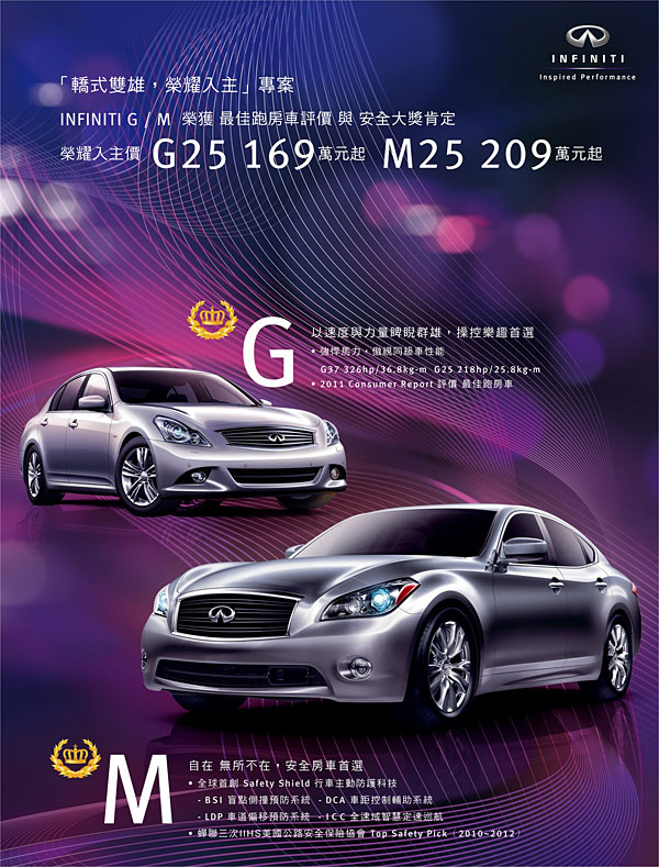 為與台灣消費者共享Infiniti勇奪汽車類「最具情感價值品牌」的至上榮耀,並感謝消費者長期以來對於Infiniti品牌的支持,自即日起至10月31日止,僅需新台幣49萬元超低頭款即可入主擁有F1靈魂的FX車款;而雙雙獲得國際安全(2012 TOP Safety Pick安全首選)及操控(2011 Consumer Report 最佳跑房車)(註4)大獎肯定的M系列及G系列則可享有M車系新台幣209萬元起,G車系新台幣169萬元起的超值限量現金優惠(註5),詳情請參閱Infiniti台灣官方網站www.Infiniti.com.tw,或洽全省Infiniti展示中心或電洽Infiniti免付費服務專線0800-333-399查詢。