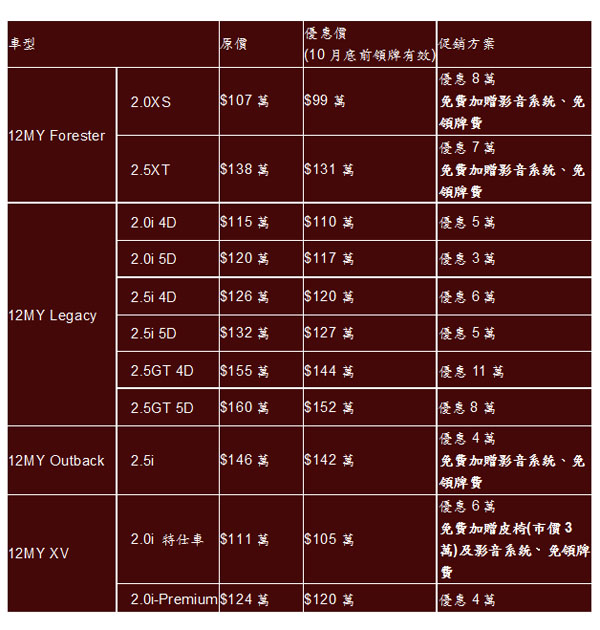 ●Subaru十月優惠專案: