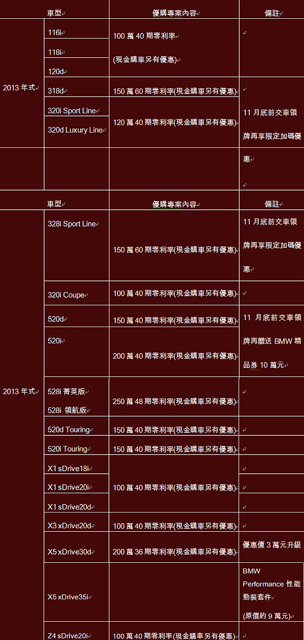 置身於BMW經典動感的座艙內,聆聽由引擎聲浪所譜成的樂章,豐沛的動力與精準的操控感令人陶醉,純粹的駕乘享受即使在離開車輛後仍餘韻猶存,回味再三。從尊榮大器的BMW大7系列豪華旗艦房車,到充滿都會時尚感的BMW 1系列五門掀背跑車,BMW引以為傲的駕駛樂趣滿足了所有車迷對駕馭的渴望。為了將這份感動帶給更多BMW的愛好者,BMW總代理汎德公司即日起推出「恆久感動」專案,針對2013年式BMW 1系列五門掀背跑車、BMW 5系列四門房車及Touring、BMW 3系列四門房車及雙門跑車、BMW X3 xDrive20d、BMW X5、BMW X1以及BMW Z4硬頂敞篷跑車推出零利率專案,現金購車另有優惠;同時更針對特定車型加碼贈送BMW精品券,絕對是您立即入主的最佳契機!