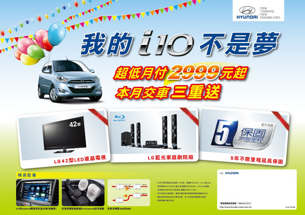 這樣的狀況對總代理南陽實業無不打了一劑強心針,對於已連續兩年國產品牌成長率第一名,在今年成為三連霸的目標越來越近。所以為了慶賀HYUNDAI銷售成長率連續三年稱冠,現在購買乘用車全車系任一車款,在本月底(11月)交車即贈送LG 42型LED液晶電視(42LS3400)+LG藍光家庭劇院組(BH6320H~2013年上市機種,為現售機種HB806TM之升級版本)+五年不限里程延長保固(六大系統)三重送。Hyundai汽車讓你有聲有色有保固,快快樂開新車。