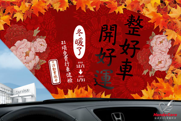 該活動自12月1日起於全國各Honda Cars經銷服務據點展開,免費行車安全檢查項目包含煞車系統、傳動軸、轉向系統、懸吊系統、避震器及輪胎檢查等21大項,Honda Taiwan並提供完成健檢服務的車輛三個月履約保證,給予最安心無慮的承諾。冬暖了活動期間同步推出保養維修分期優惠及「老朋友特惠」方案,超過1,500項以上的零件享折扣,要為車主省下大筆荷包錢。詳情內容請上Honda Taiwan官方網站http://www.honda-taiwan.com.tw/或洽全國各Honda Cars查詢。