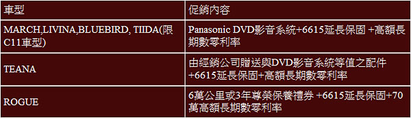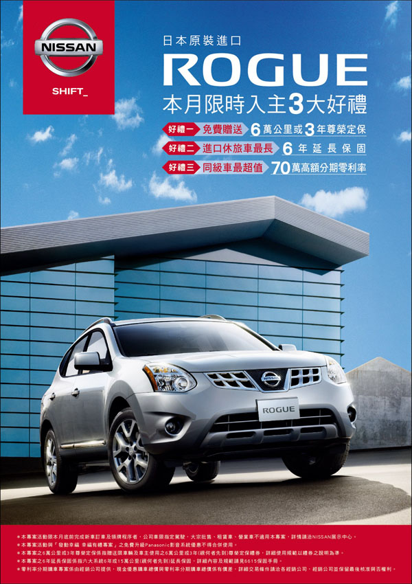 註4:「Rogue尊榮好禮」專案活動與「發動幸福 幸福有禮專案」之免費升級Panasonic DVD影音娛樂系統優惠不得合併使用。本專案之6萬公里或3年尊榮定保係指贈送限車輛及車主使用之6萬公里或3年(視何者先到)尊榮定保禮券,詳細使用規範以禮券之說明為準。