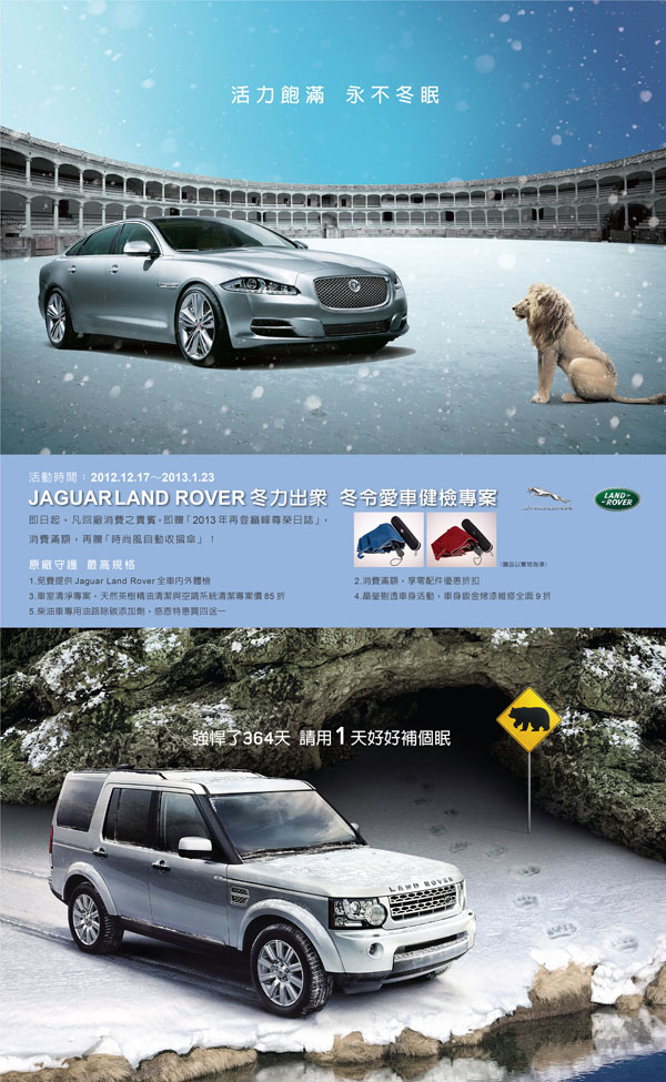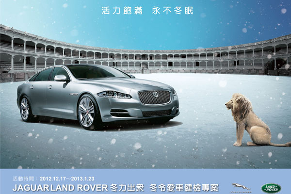 Jaguar Land Rover關懷車主歲末年終以及迎接即將到來的2013年,台灣總代理九和汽車為確保每位Jaguar Land Rover車主健康安全,以及愛車在寒冬中的良好車況,能安心過好年,將於2012年12月17日起至2013年1月26日,舉辦貼心而尊榮的Jaguar Land Rover冬令健診服務活動,確保您的愛車能從容而愉悅地面對寶島濕冷嚴寒氣候,維持相關系統正常運轉、以及車室內乾淨清新的環境,以愛護車主的最高服務承諾,給予Jaguar & Land Rover車主最悉心的照顧。Jaguar Land Rover台灣總代理九和汽車,邀請車主就近前往當地原廠授權服務廠,為愛車進行Jaguar Land Rover冬令免費健診,確保愛車奔馳順暢,安心過好年!