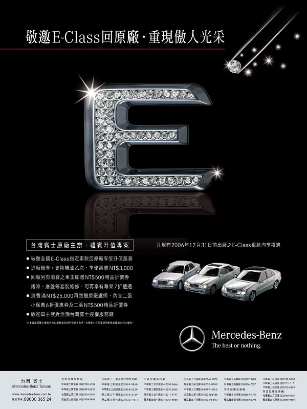 自1947年發表以來,Mercedes-Benz E-Class獲得全球超過千萬位車主的口碑與見證。台灣賓士為長保每部E-Class車款的經典魅力,凡2006年12月31日前出廠之E-Class車款均能參加【E-Class禮賓升值專案】,以貴賓優惠價3,000元回廠更換機油與進行車況檢測,並可享有特惠7折之烤漆及底盤等套裝維修;此外,若於回廠後另有消費將可獲贈賓士精品折價券、消費滿25,000元將可獲贈特惠6折之小保養服務,讓車主與愛車同時體驗賓士原廠的頂級工藝及專業服務。