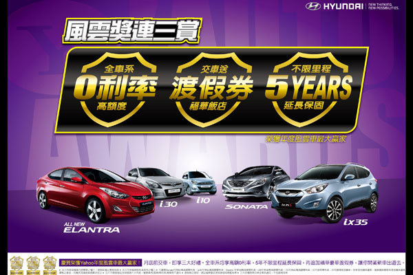 Hyundai在4月份推出的乘用車全車系的「風雲獎連三賞」三大好禮:全車系高額度0利率、交車送福華渡假券、五年不限里程延長保固,總優惠價值高達市價45,000~50,000元。