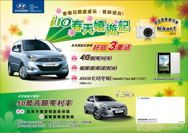 總代理南陽實業表示,以往對於五年不限里程延長保固,僅在於國產乘用車系上,但為慶賀成為YAHOO年度風雲車最大贏家,本月的加碼連進口車系一併納入優惠範圍。不僅如此,微型旗艦i10在本月(4月)交車享「好旅3重送」:高額度40萬0利率、五星級連鎖飯店住宿券、ASUS七吋平版(MeMO Pad ME172V),再加上「五年不限里程延長保固」總優惠價值高達市價45,000元。