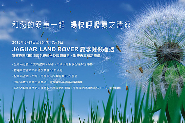 為使Jaguar Land Rover車主享受快意舒適的2013年夏季,台灣總代理九和汽車於即日起至7月6日,舉辦貼心而尊榮的2013年夏季健檢服務活動,確保您的愛車從容面對寶島酷熱氣候,維持相關系統正常運轉、以及車室內乾淨清新的環境,Jaguar Land Rover以愛護車主的最高服務承諾,給予車主最悉心的照顧。Jaguar Land Rover台灣總代理九和汽車,邀請全台車主前往各授權經銷商服務廠,為愛車進行2013年夏季健康檢查,確保愛車無論在烈陽下奔馳時順暢無虞。