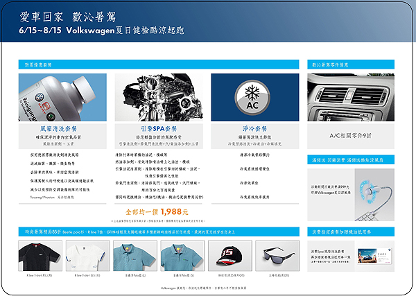 Volkswagen夏季健檢期間,車主回廠皆享有免費20項冷氣空調系統檢查,了解目前愛車的空調使用情形以及效能,若需進行更換則享冷氣空調相關零件9折。同時推出三大活動主題套餐,包括風箱清洗套餐、引擎SPA以及淨冷冷媒更換套餐等,在即將來臨的盛夏時分,帶給所有車主舒爽的車室環境以及輕盈如新的駕駛感受。消費活動指定套餐,再享雙重優惠,加碼贈送保養機油抵用券。