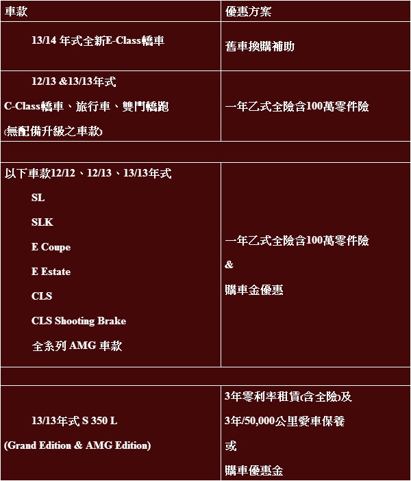 而台灣賓士針對旗下夢幻車款12/12、12/13、13/13年式(SLK/SL/E Coupe/E Estate/CLS/CLS Shooting Brake及所有AMG車型)推出限時購車優惠!即日起至7月31日止完成交車、掛牌之客戶,除享有1年乙式全險含100萬零件險之外,台灣賓士更加碼購車優惠金,輕鬆擁有經典勁駒,成為最令人羨慕的焦點。