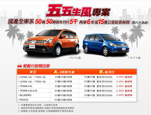 裕隆日產汽車即日起至5月31日止推出之「五五生風專案」,釋出最大購車優惠與延長保固,消費者請立即把握此波難得的購車良機。活動詳情請洽全台裕隆日產展示間或上網查詢www.Nissan.com.tw。