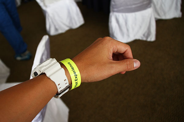 採取與「小班教學」的相同思維,以四個顏色區分出四個小隊,以不同順序的體驗多道關卡,筆者如手環所示為黃隊。