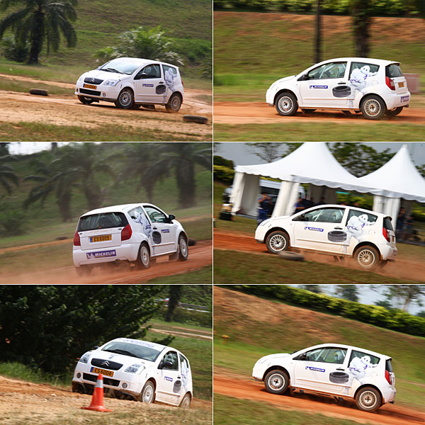 別看Citroen C2嬌小的身型,僅有150bhp的馬力輸出,但由於全車標準的賽車規格,全車拆空與防滾籠加裝,加上兩只賽車椅,全車重僅有650kg,搭配上14/65-15的Michelin專用越野胎,在專屬的越野場地中,也可以帶來了不低的樂趣。雖然非第一次於越野場地上駕駛,但過去總是以慢速、征服障礙為主,以此類競速的方式奔馳,還真是新鮮的第一次。