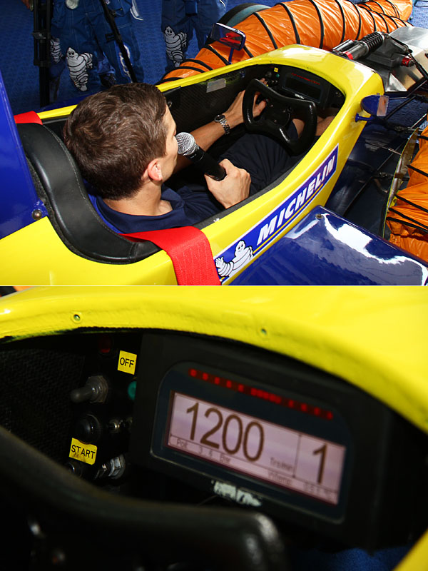也因此,為了讓與會的學員可以先行熟悉這賽道機器,原廠人員先透過放置於專屬機器上的同款米其林方程式賽車,讓大夥在正式上賽道前,可以先坐進駕駛座艙,了解這序列式排擋、這猶如戰鬥機的方向盤,是怎麼回事。