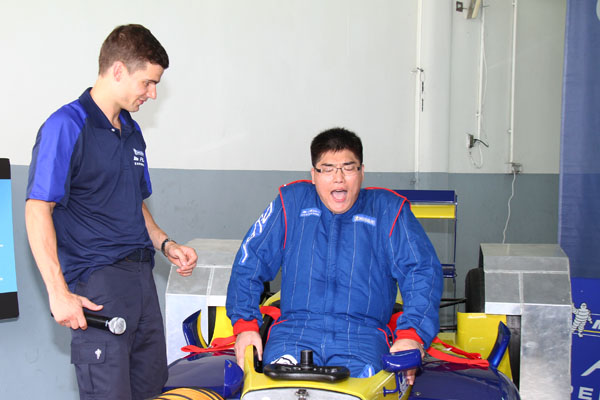 教練親身示範如何坐進狹窄的方程式賽車座艙內。基本上就是以雙手撐體,腳放置定位後,再將手伸進座艙內。
