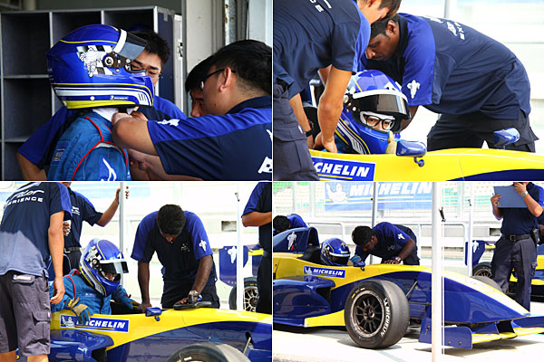 由於賽車數量有限,因此在等待的時光,現場工作人員會幫你穿戴頭套、全罩安全帽與手套,加上原有的賽車服與賽車鞋,雖然少了內襯的防火衣,但至少整體的裝備已十分週全,也可顯現出米其林賽車體驗營對於安全的重視,與舉辦活動的嚴謹程度。