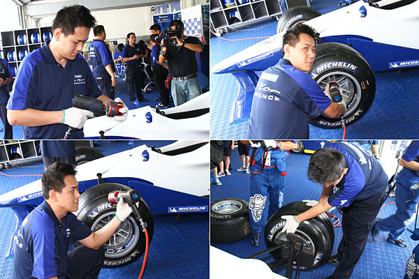 而於方程式賽式中常見到的換胎過程,為何Pit區內的工作人員,總可以「秒殺」的方式,完成更換賽車胎圈與加油的動作?這關卡,就是要以親身操作,來讓所有學員了解這工作人員的工作內容。要於短時間內進行最快的放鬆螺母或鎖緊螺母,氣動扳手是少不了的必要工具,只需調整後方的旋鈕,便可進行放鬆或鎖緊的動作,且為了縮短換胎時間,輪圈固定螺母也改以單一中心樣式,加上輕量化的輪圈加速了拆裝的時間。實際操作,雖然首次體驗、動作也不甚流暢、一不小心還磨破了手指皮,但有模有樣的姿態,仍可於短時間內完成換胎,同樣輔以兩隊競技的體驗方式,就在隊友的加油與搭配下,完成了此次換胎的體驗;當全隊動作完成、高舉雙手報好時,不僅融會貫通了此技巧,心臟的高頻率跳動,更讓人大感痛快的難忘!