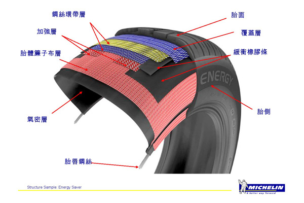 對於大部分駕駛者來說,輪胎給人的刻板印象就是一塊外觀不甚起眼的黑色橡膠物體,主要成分為天然橡膠,而胎面和胎邊則是外觀唯二能夠看見的部份,當技師將輪胎安裝至鋁圈時,頂多也只能往裡面看到覆蓋內面膠的氣密層,可千萬別以為這就是輪胎胎體結構的全部,其內部可是大有學問!因為胎體本身需要具備足夠的強度、韌性與彈性,如此才能在無數次滾動向前行駛過程中,隨時承受來自路面的強烈震動與衝擊,以及來自輪胎本身四面八方的慣性運動作用力,就讓台灣米其林為您層層解析輪胎的基本結構:
