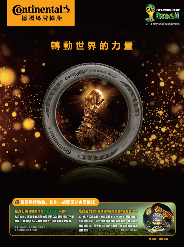 為了行車安全,每月至少定期檢查一次胎壓。保持正常胎壓,可減少油耗、維持輪胎功能,更延長輪胎壽命。暑假出遊旺季即將到來,建議先到全省馬牌經銷店為汽車輪胎打氣,七月底前,還有機會獲得限量10,000份的7-ELEVEn冰淇淋電子兌換券。購買4條輪胎還可獲得馬牌獨家世足紀念足球。贈品數量有限,送完為止。