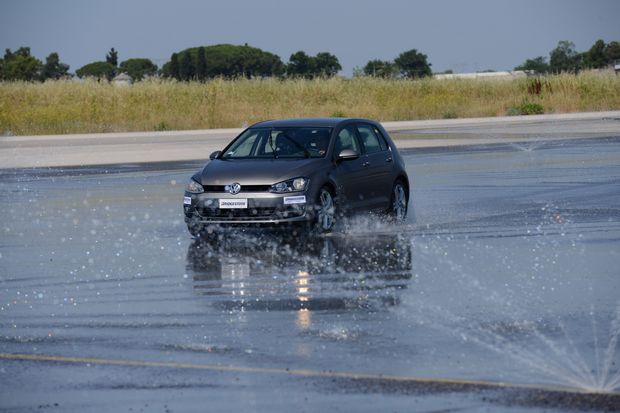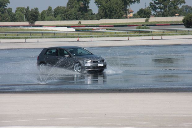 第二關卡體驗S001輪胎的Skid Pad環狀灑水道,目地是讓媒體親自駕駛手排Golf TDI車款在持續噴水的環型側試跑道,同時有加入計時比賽,筆者是Golf的愛好者,能夠親自駕駛手排車更是興奮,所以在駛入特定的計時狀態下,並沒有特別加速求取成績,其實情況是水柱不斷的噴到檔風玻璃上,要看清楚路面並不容易,但是可以感覺得出車輛在三檔的情況下不斷的加速,輪胎的排水性還是很好,車身沒有什麼打滑,也讓人見識到S001的濕地優異排水性能。