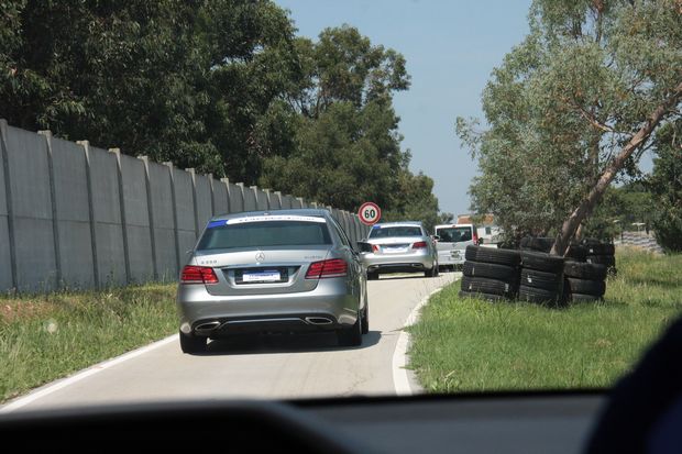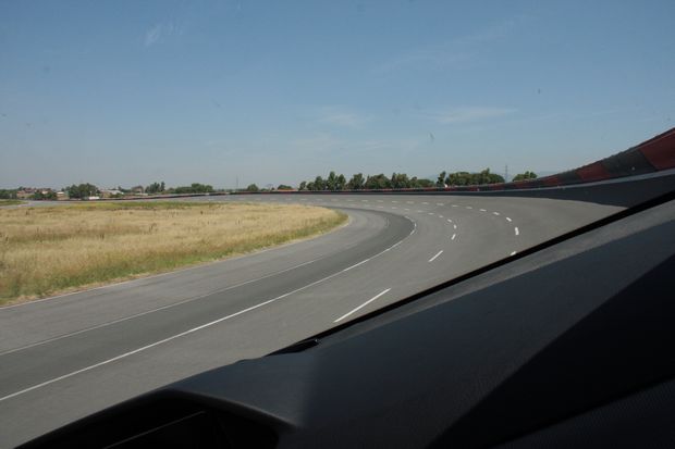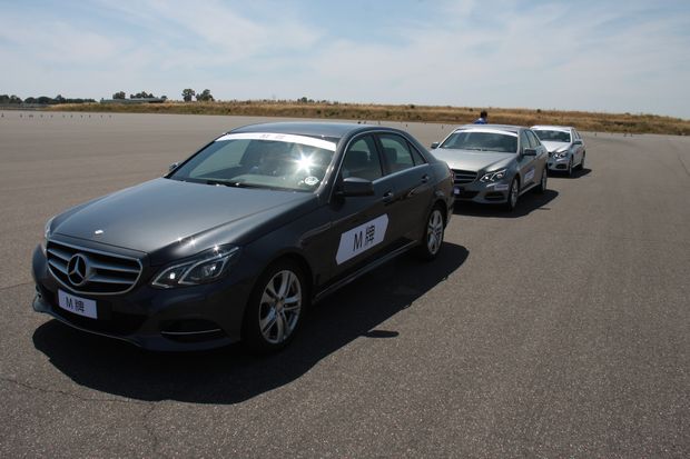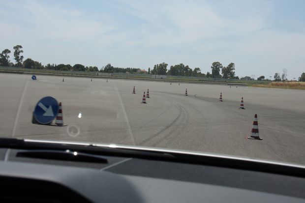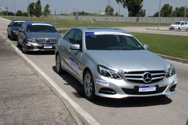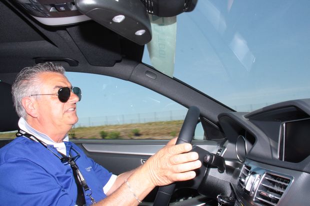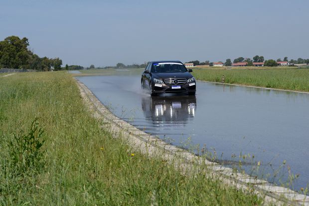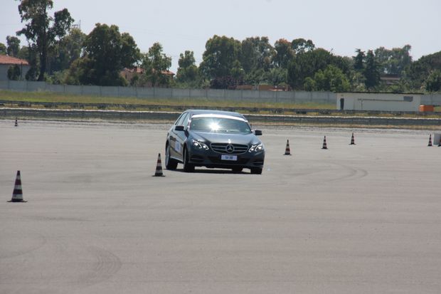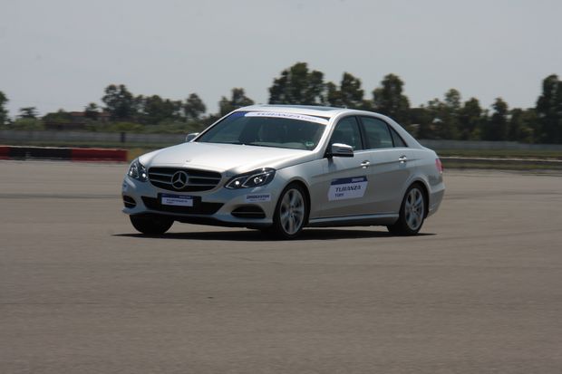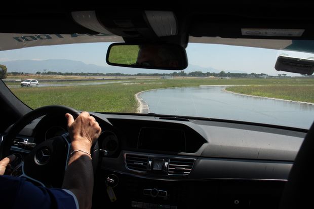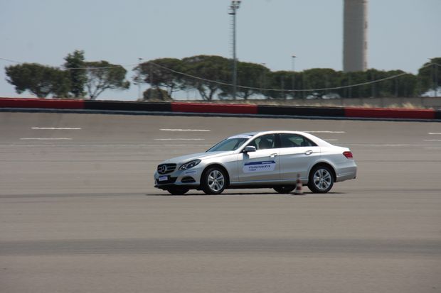 在教練的帶領下,我們搭上了搭配了245/45R17的M.Benz E350車款,進行四公里環型測試道的高速體驗,時速約在50公里到140公里交替,最後直線加速到200公里時速,當然輪胎是穩定又安靜,完全符合歐系高級車的市場設定。