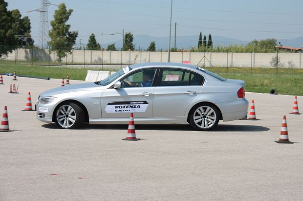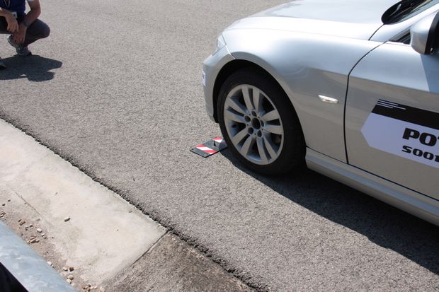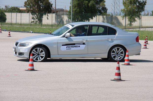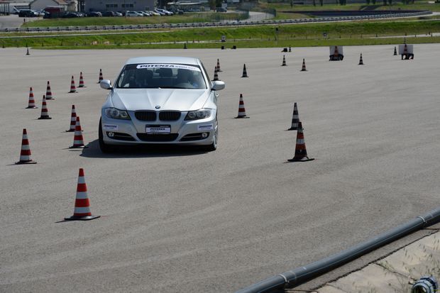 第五關卡看來比較驚險,以S001的RTF失壓續跑胎跟S001的輪胎來做爆胎後的行駛路感差異,教練有用錐桶在場地內排出了一條路線,其中還包括可以加速到時速80公里後煞車,也有90度轉向的路線,然後出發前就刺破一條S001失壓續跑胎與一條沒有失壓續跑的正常S001輪胎,接下來等漏氣差不多的情況下,交給媒體駛入規範的路線。由於沒有開過爆胎還持續行駛的狀態,的確這兩條胎的循跡控制差異性,S001失壓續跑胎真的能有較好的操控性,轉向加速急煞也有不錯的表現,令爆胎後的不穩定性降到最低,真的是功能取向的輪胎。但是令筆者很驚訝的部分,在於即使不是失壓續跑胎,一般的S001在爆胎後不斷的行駛下,也是有著不俗的水準!爆胎的差異是在高速路面的臨時反應影響會較大,一般時速60公里以下影響操控較小,但就是在高速時保護駕駛人瞬間的操控安全,才是失壓續跑胎發揮本領的地方!