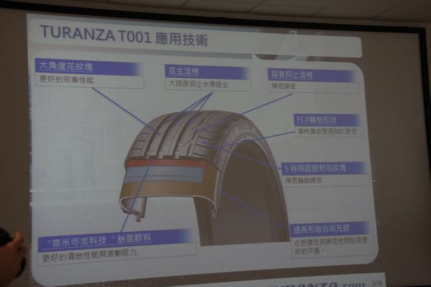 這次的主角稱為TURANZA T001,在品牌的產品定位是偏向高級舒適胎的用途,但是像是大家熟悉的POTENZA S001與RE002則是偏向運動化的性能胎。另外今年年初推出的Nextry系列就是主打經濟環保省油的設定!