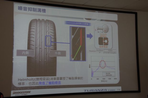 TURANZA T001較為特殊的創新科技首先要算是運用了Helmholtz(赫姆霍茲)原理來降低輪胎噪音,在輪胎的外側溝槽中設計了一個燒杯型狀的空間來消弭輪胎滾動空氣擠壓胎間產生的噪音,這點很是特殊。
