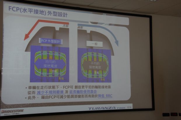 最後是水平接地設計(FCP Flat Contact Patch),以輪胎壓在地面的胎塊分析,能夠全面的貼在路面上均勻的接地寬度,要比不均勻的接地寬度來得耐用與延長輪胎壽命,也算一份獨家技術。