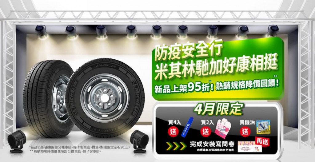 2019年,台灣米其林導入O2O(Online to online)模式,成為國內第一個使用電商管道銷售的輪胎品牌。許多消費者透過PChome「米其林馳加旗艦館」,享受了線上輕鬆選購輪胎、預約服務的便利。今年四月份更祭出多種線上優惠,為疫情的緊繃氣氛注入振奮人心的好消息。4月1日起至30日止,共20種規格的上架新品,95折優惠;架上熱銷指定品項也降價回饋,最高降幅達 $1,300/條,四條輪胎最多可省 $5,200!