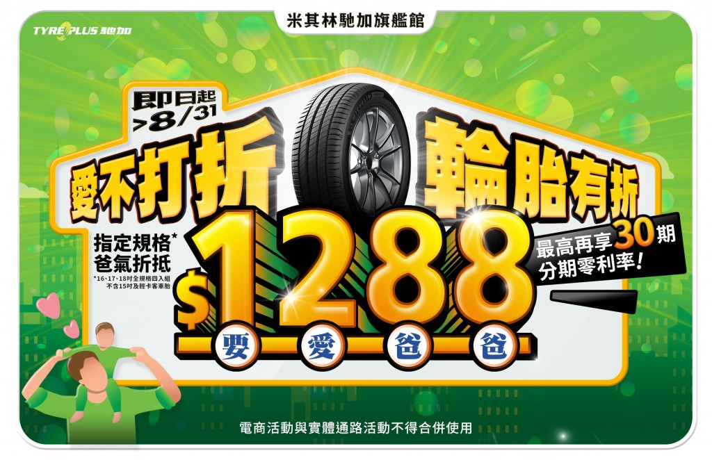 8 月 3 日至 31 日,凡購買 4 入組輪胎 (不含 15 吋及輕卡客車胎),立即享有「要愛爸爸」$1,288 貼心折扣;購買 8 月精選胎款 ENERGY XM2+ 指定規格(195/60 R15,4 入組),即享超優惠精選價,只需 $9888 元!除了折扣優惠外,米其林馳加旗艦館更祭出限量購胎禮。活動期間內,只要購買 4 入組輪胎即贈送「戶外保冷神物-米其林保冷摺疊露營椅」(限量 40 組);購買 2 入組輪胎或機油保養套餐,即可獲得米其林隔熱手套一份。