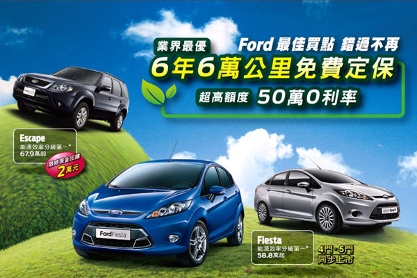 Ford與民眾一同對抗高消費時代,七月份針對旗下 Fiesta、Mondeo、 Focus及Escape全車系,祭出業界最優6年6萬公里免費定保促銷專案,並同時搭配50萬高額零利率專案,福特讓民眾入主新車輕鬆無負擔。Ford不惜重金推出業界最優促銷方案,提供夏季購車最佳買點,消費者立即前往Ford展示中心下訂搶購,機會錯過不再。
