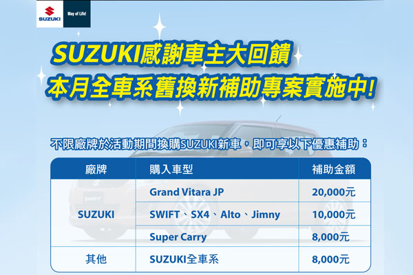 Suzuki於本月推出車輛舊換新活動,並邀請其他廠牌車主一同參與,不論您現在開的是哪款車型,哪種品牌車輛,凡於11月份購車就有折扣!