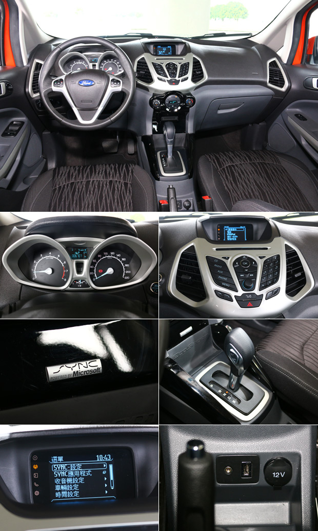 Ford EcoSport都會尊貴型以標配的「SYNC」通訊娛樂整合系統為號召,中控上方顯示屏的文字,更是全繁體中文化,六速PowerShift排檔桿後方、手煞車的下方,則標配Aux-in與USB插槽,一旁還有12V電源插座。