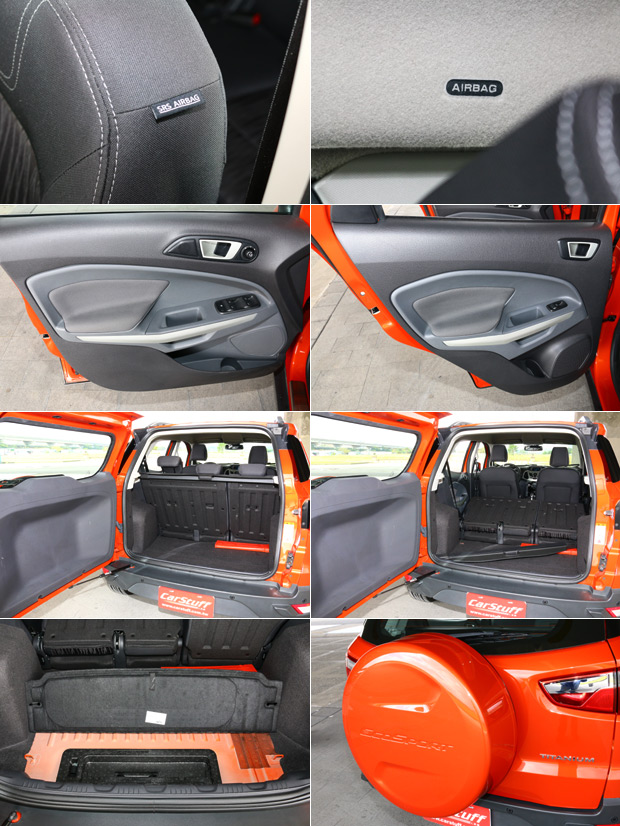 EcoSport全車系標配六具安全氣囊,而車室空間的運用、與後排座椅的機能則有Yeti的影子,然而,側開式的尾門、與外掛的備胎組,對台灣的用車環境來說實在不適合。