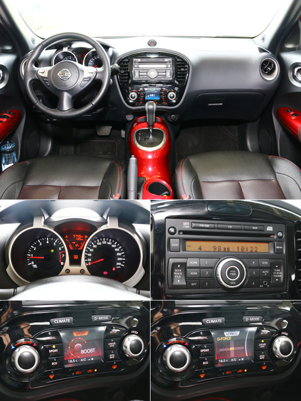 Nissan Juke以設計感為第一優先,除了以二輪仿賽車油箱為靈感的排檔座之外,潛望鏡型式的雙環儀表中央設有多功能顯示屏,而中控台音響介面與下方的I-CON系統搭配,在視覺上給人繁複的感受,不過I-CON系統G力等等的顯示模式,擺明就要駕駛人盡情地操駕Juke。(圖示為1.6 Turbo 4WD車型,因此有Boost渦輪增壓顯示)
