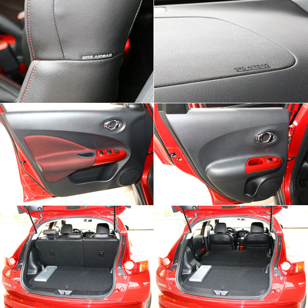 Nissan Juke車頂往後、下掠的線條,以及尾門斜切、上端與C柱頂點相接的設計,是造就後座空間不足的主因之一,而就剛開始提及Juke所想要呈現的設計感,實際已凌駕於實用機能之上,不過,Juke所瞄準的客層,也不會是以實用性為考量重點的消費者,會買Juke的消費者,就是想要與眾不同,而Juke本身,也可以將其定位為一輛挑高的掀背跑車,全車系標配ABS + EBD + BAS、以及VDC動態穩定與TCS循跡防滑的Juke,也的確擁有能盡情奔馳的堅強主被動安全後盾。