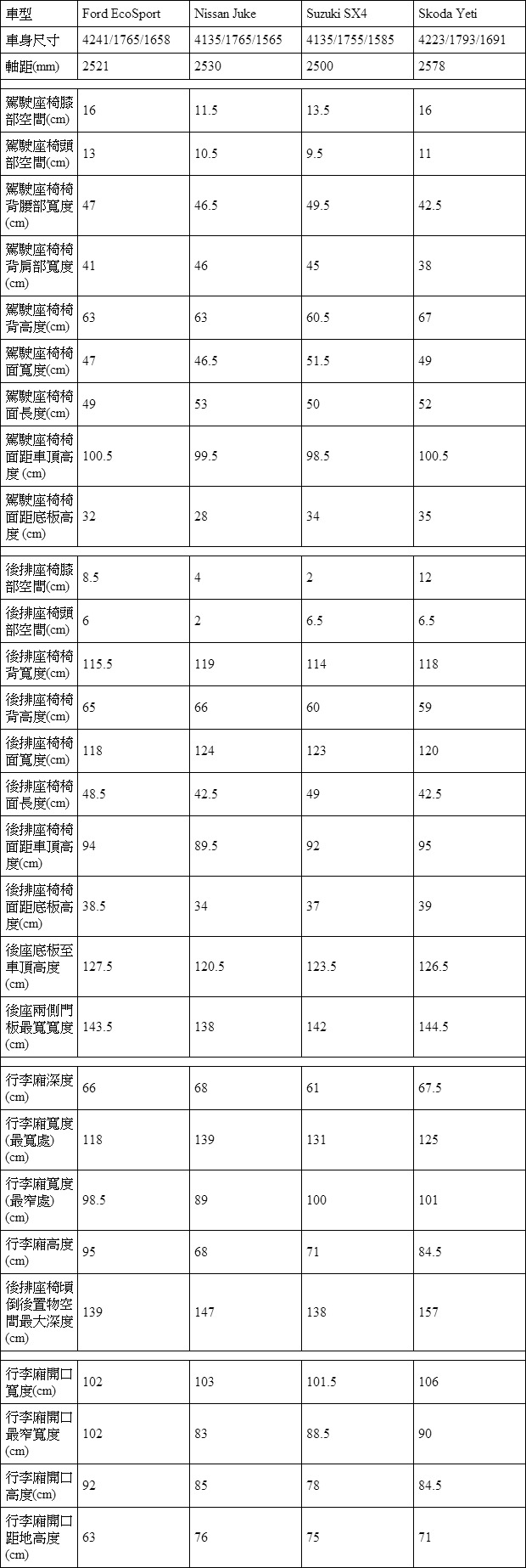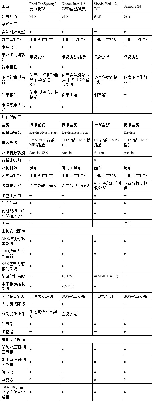 Nissan Juke、Ford EcoSport兩款甫導入台灣市場的小型跨界休旅新兵,欲挑戰此級距已十分成熟的兩款產品─Skoda Yeti與Suzuki SX4,本篇將就實用性、與配備面來做比較。